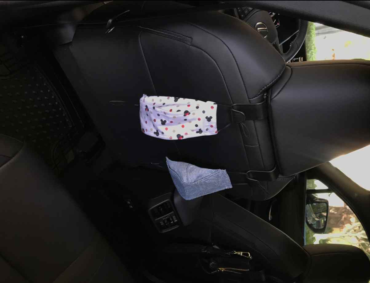 I spend 2.5 hours in my car every day, so I added two of these at the front seat of my car to hold up face masks without them falling down at the far side, and to hold up my sunglasses on the closer side (they clip in, actually, so it works even better than I thought). I also use it to hang up any items that need it, like a work vest, or a grocery bag with smt breakable in it. It clips onto the metal pieces of the headrest, and although in my mini, they fit completely on the seats, in the BMW they rest "on top" of the seats on the front. It works fine. I clip them off if I have a passenger with me, but most of the time I do not.
