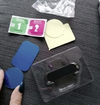 Each order comes with a rectangular- and circle-shaped adhesive magnet plate which you place onto the back of your phone. This magnet helps your phone stick to the magnetic holder strip.