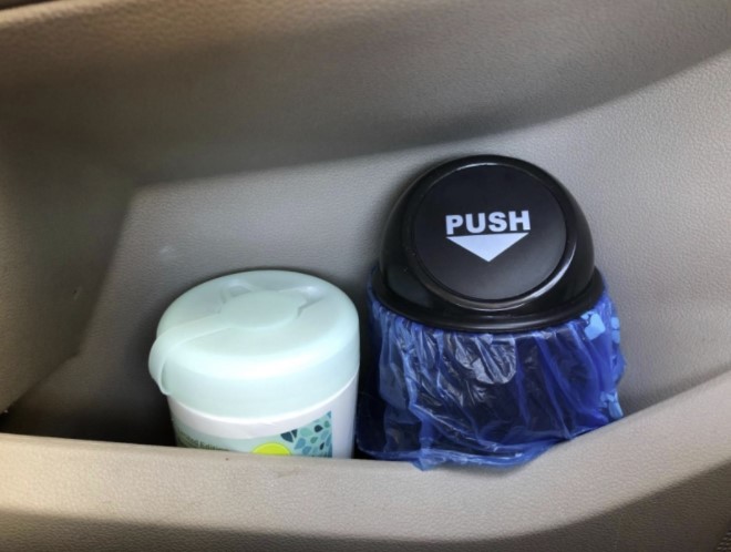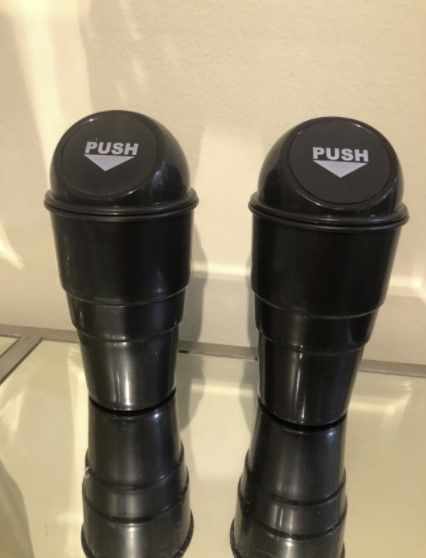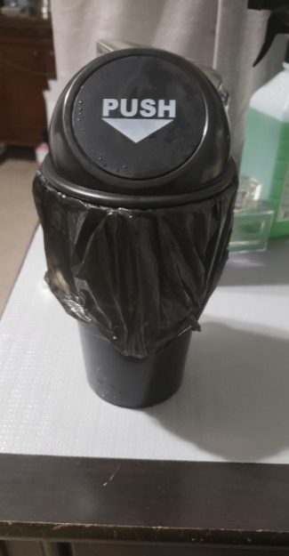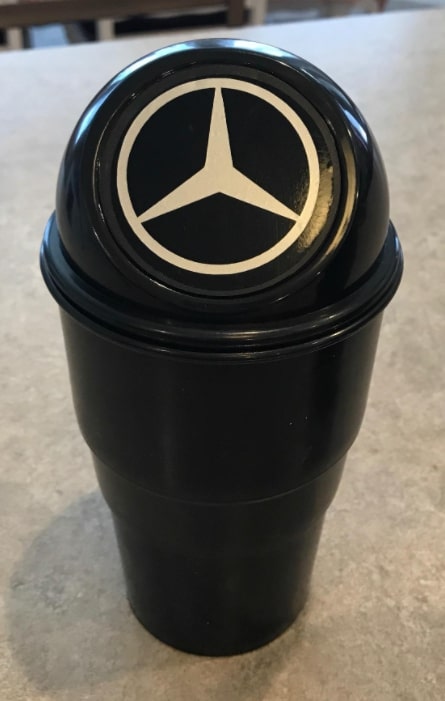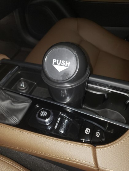 Made from non-toxic ABS plastic, our little trash bin mimics the look of large, full-sized trash cans, with a “PUSH” logo at the lid opening. The can fits right into a standard-sized cup holder for a trash bin for snack wrappers right within your reach. The can measures 7.9 x 2.7 inches (L x W).
