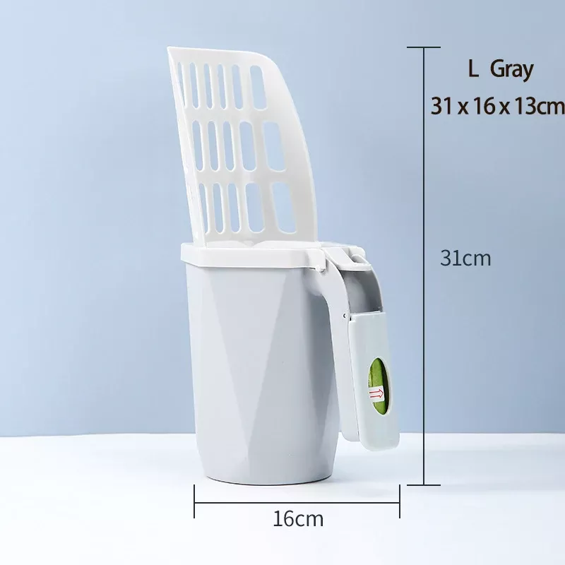 This cat litter scoop stands out with its thoughtful and ergonomic design. Available in two sizes, M and L, it caters to all cat owners’ needs. Whether you have a smaller litter box or need something larger for multiple cats, this scoop has got you covered. Its comfortable, anti-slip handle ensures ease of use, while the built-in garbage bag holder keeps everything you need within reach. The scoop’s integrated waste bin with sloping partition ensures that clumps stay securely inside, preventing any accidental mess.