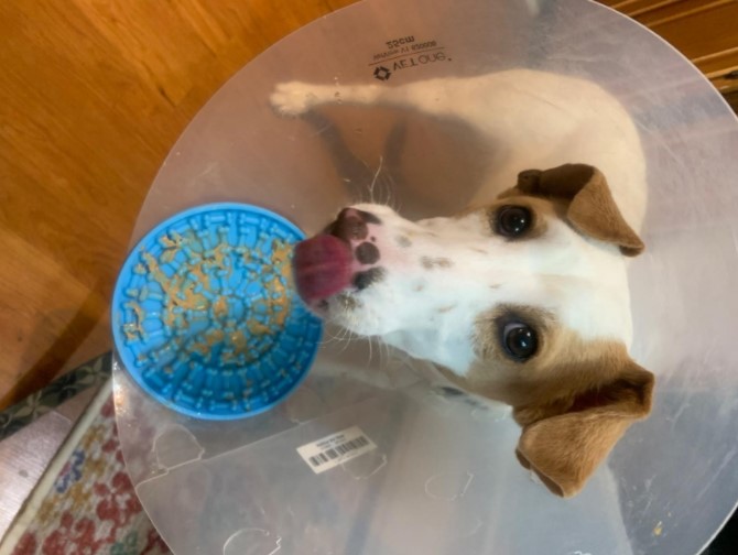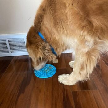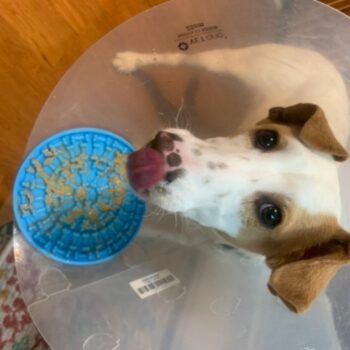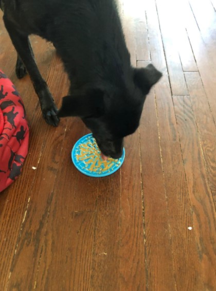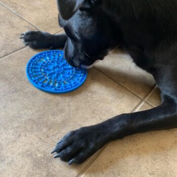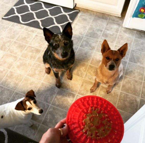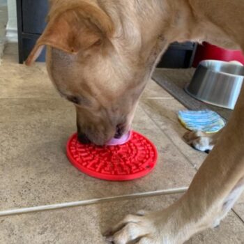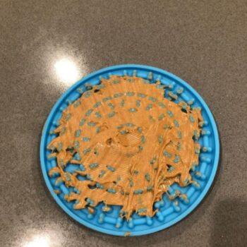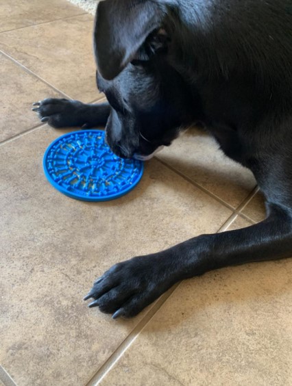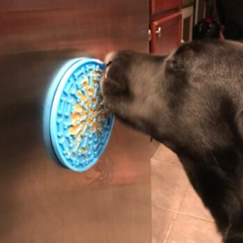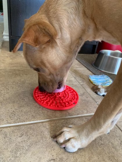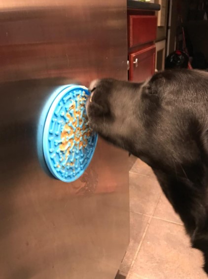 My dog gets hotspots all the time (it’s a bulldog thing) and the only thing that helps is this healing balm called Skin Soother. Problem is, he is very active. Everytime I approach him, he thinks it’s playtime and would start running with a ball in his mouth. I bought this product hoping he would actually stay in one place for at least a minute. Worked like magic. A tablespoon of peanut butter goes a really long way. I spread it really thin and place it a bit higher so he has to work for it and not get bored easily. It gave me 8 minutes; enough time to apply his healing balm and actually see hotspots that I’m not aware of.