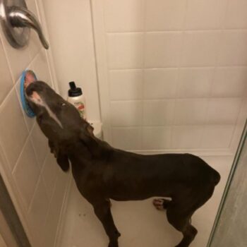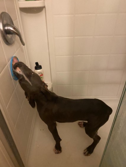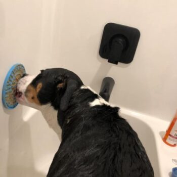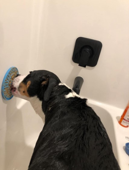 This was difficult to get to stay in place on the tile wall. It didn’t make Bath time any easier to have this falling off and smearing peanut butter on the pup when fell. It was a pain to clean. Probably cleans easily in a dishwasher. But hand washing required lots of soaking and scrubbing, multiple times. More trouble than it was worth.