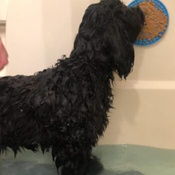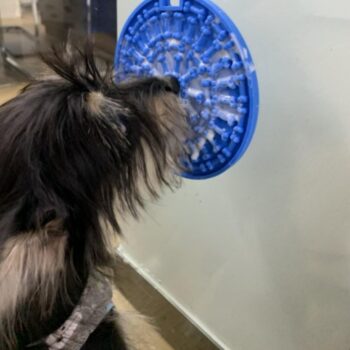 I used this to calm my hyper neurotic schnauzer during grooming. Poor little guy was abused by a groomer when he was young, and has been VERY difficult to groom ever since. I’ve long been on the lookout for anything that will help calm him. Can’t take him to a groomer anymore, because he gets so stressed out. Grooming can take hours because he is so nervous. This tool was amazing. I was able to use the electric trimmer to do his belly, back and hind quarters quickly with no drama! Going to try it with my other schnauzer during his bath. My advice is to use just a little peanut butter or wet dog food at a time. Very thin layer. That way the dog really has to work for it and doesn’t fill up and get bored. This is the best grooming aid ever! It’s a wonderful, wonderful thing!!!!!!!