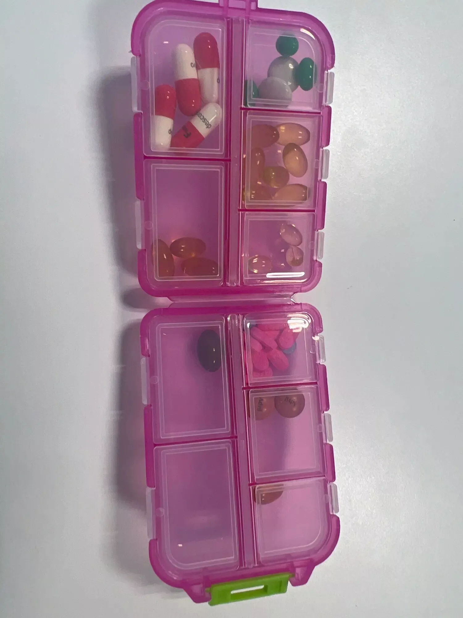 I adore this versatile pill box. Its numerous compartments make it suitable for more than just pills, and its size is just right—not too large to fit comfortably in a purse. I carry mine with me constantly. In addition to holding pills, it serves as a handy storage spot for small items like buttons, ensuring they won't get lost. The flexibility of the compartments allows you to store whatever you need, making it perfect for coordinating with different color schemes or organizing various items.