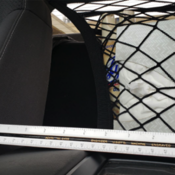 I got this to try and help keep my puppers from jumping in the front seat as soon as I close the door. As you can see from the pictures, there's almost a 6 inch gap on both sides of the net which renders it almost useless for keeping my puppers at bay. I figure that with a normal-sized car or small SUV, the seat gap is not a problem as it is with mine. This product is stretched for all its worth in my truck (Silverado). I got tissue and a can of disinfectant in there, but it's t-i-g-h-t. I'm going to use it until it snaps, which looks like it could happen at any moment, honestly. I just hope it doesn't hit me in the process. With the small size out of the way, it was still easy to install and I don't feel like the hooks would come loose on their own. I think this would work great on something smaller, but it definitely is not made for what I drive.