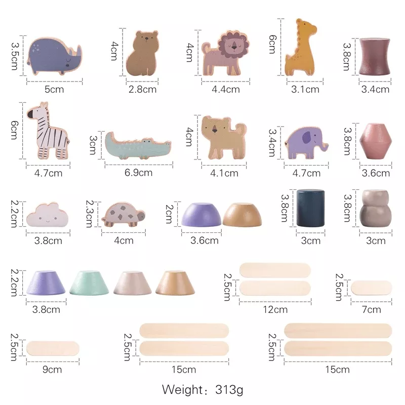 • Design: Includes various animal figures and geometric shapes for balanced stacking