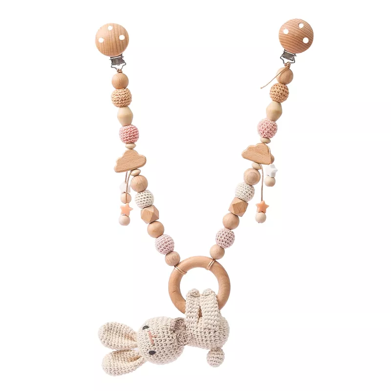 This charming wooden baby gym stroller hanging pendant toy is designed to captivate and soothe your little one while encouraging sensory development. The set includes a delightful bunny pendant, crochet animal figures, and wooden beads, all crafted with care. The soft textures and natural wooden elements make it the perfect companion for babies, whether it’s during playtime or when calming them down for a nap.